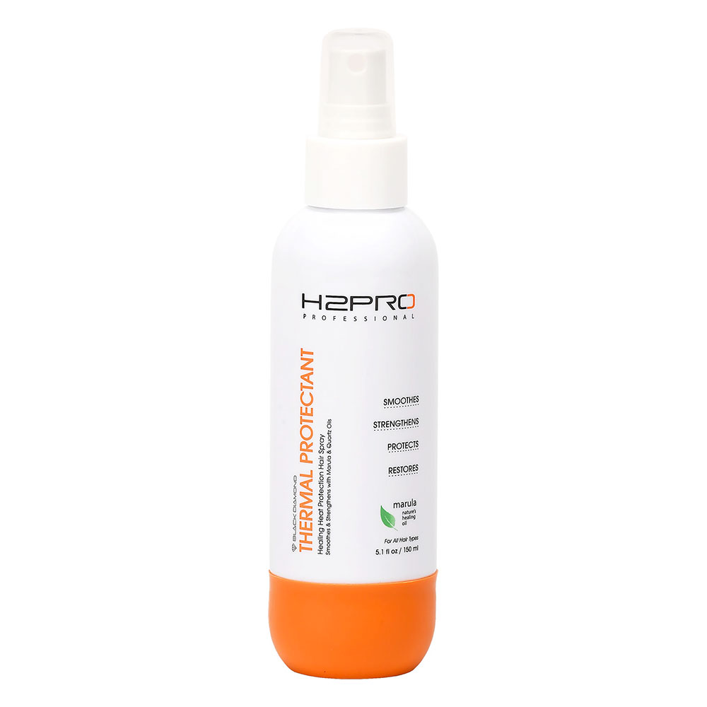 The H2PRO Black Diamond Thermal Protectant is a lightweight spray that protects hair from heat up to 450°F. A highly therapeutic blend of Rosemary, Chamomile, and Witch Hazel balance pH and restores scalp health for improved hair growth. The magical Marula Oil protects hair from environmental aggressors and regenerates hair for ultimate shine and health. Damaged and broken hairs are restored and hair regains shine to create a frizz-free, glowing style.